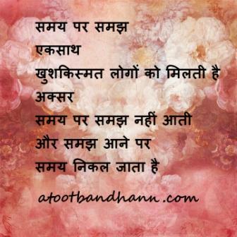 समय पर समझ January 4, 2020February 28, 2016 by अटूट बंधन समय पर समझ एकसाथ खुशकिस्मत लोगों को मिलती है अक्सर समय पर समझ नहीं आती और समझ आने पर समय निकल जाता है