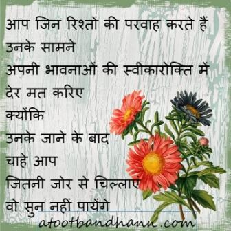 सद्विचार – रिश्तों की परवाह January 4, 2020March 21, 2016 by अटूट बंधन आप जिन रिश्तों की परवाह करते हैं उनके सामने अपनी भावनाओं की स्वीकारोक्ति में देर मत करिए क्योंकि उनके जाने के बाद चाहे आप जितनी जोर से चिल्लाएं वो सुन नहीं पायेंगे