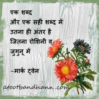 सद्विचार -सही शब्द January 4, 2020March 21, 2016 by अटूट बंधन एक शब्द और एक सही शब्द में उतना ही अंतर है जितना रोशिनी व् जुगुनू में -मार्क ट्वेन