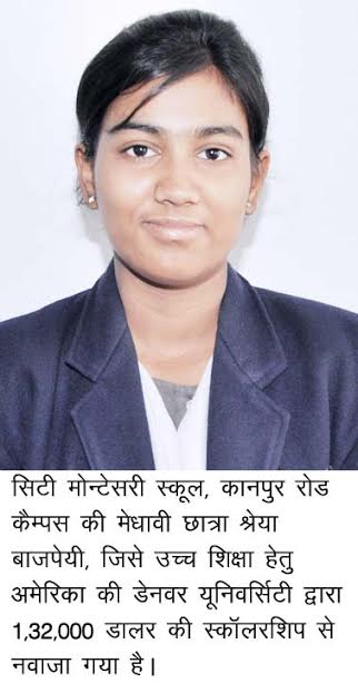 लखनऊ, 27 अप्रैल। सिटी मोन्टेसरी स्कूल, कानपुर रोड कैम्पस की छात्रा श्रेया वाजपेयी ने अपने उत्कृष्ट शैक्षिक रिकार्ड की बदौलत यूनिवर्सिटी ऑफ डेनवर, अमेरिका में स्नातक कोर्स हेतु चयनित होकर विद्यालय का नाम गौरवान्वित किया है। इसके साथ ही, श्रेया को 1,32,000 डालर की स्कॉलरशिप से भी नवाजा गया है, जो कि चार वर्षीय शिक्षा अवधि के दौरान प्रदान की जायेगी। यह जानकारी सी.एम.एस. के मुख्य जन-सम्पर्क अधिकारी श्री हरि ओम शर्मा ने दी है। श्री शर्मा ने बताया कि सी.एम.एस. कानपुर रोड कैम्पस की इस प्रतिभाशाली छात्रा को उत्कृष्ट ज्ञान-विज्ञान एवं नवीन अवधारणाओं के सृजन की अद्भुद क्षमता के आधार पर चयनित किया गया है।